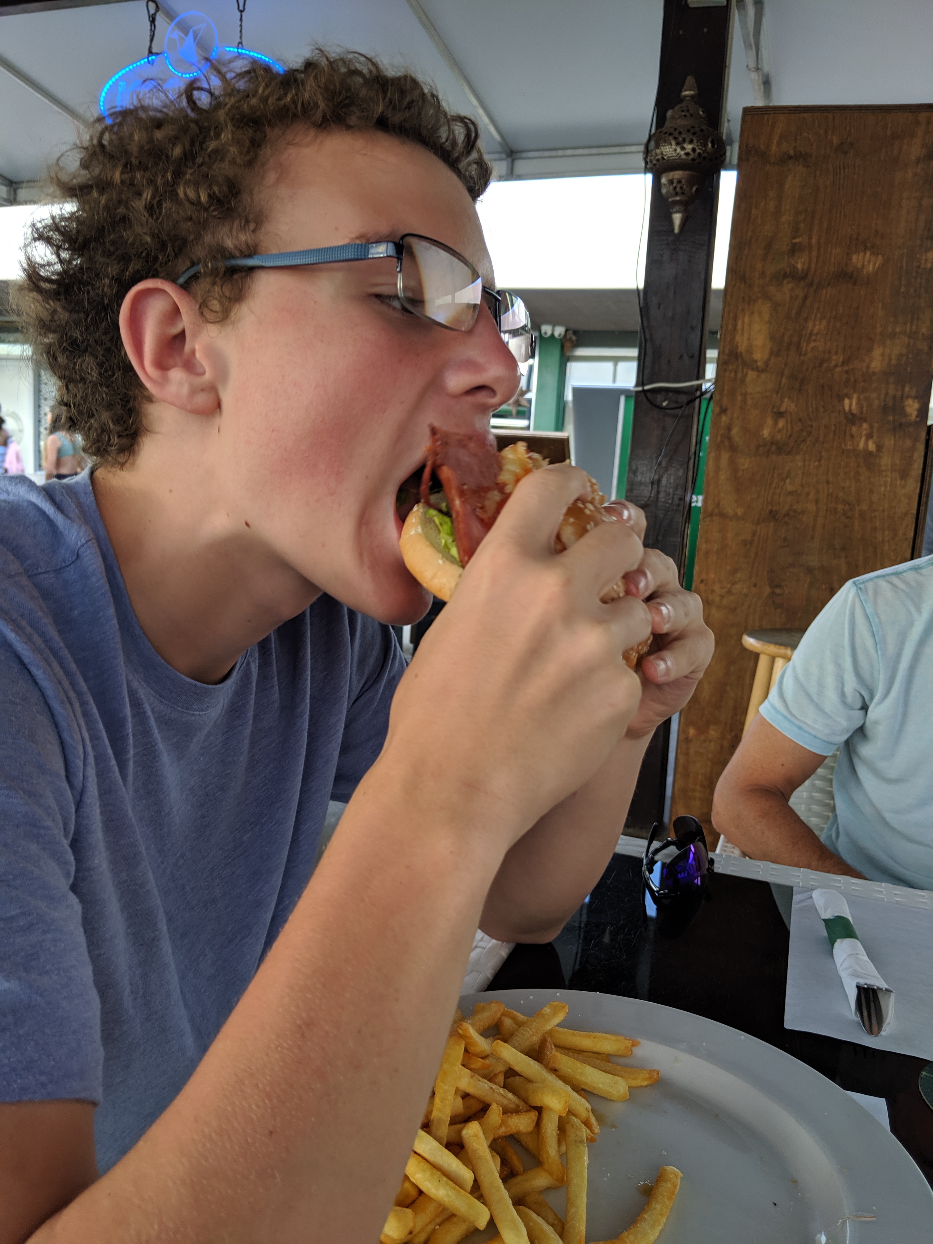 Immediately, Cole found the burger section and saw they had a Pizza Burger! I believe his immediate reaction was “Why didn’t America invent this??” Of course, both Jack and Cole ordered the burger. It did not disappoint. It was “Texas big” and melded a pizza and a burger into one, and it was juicy!