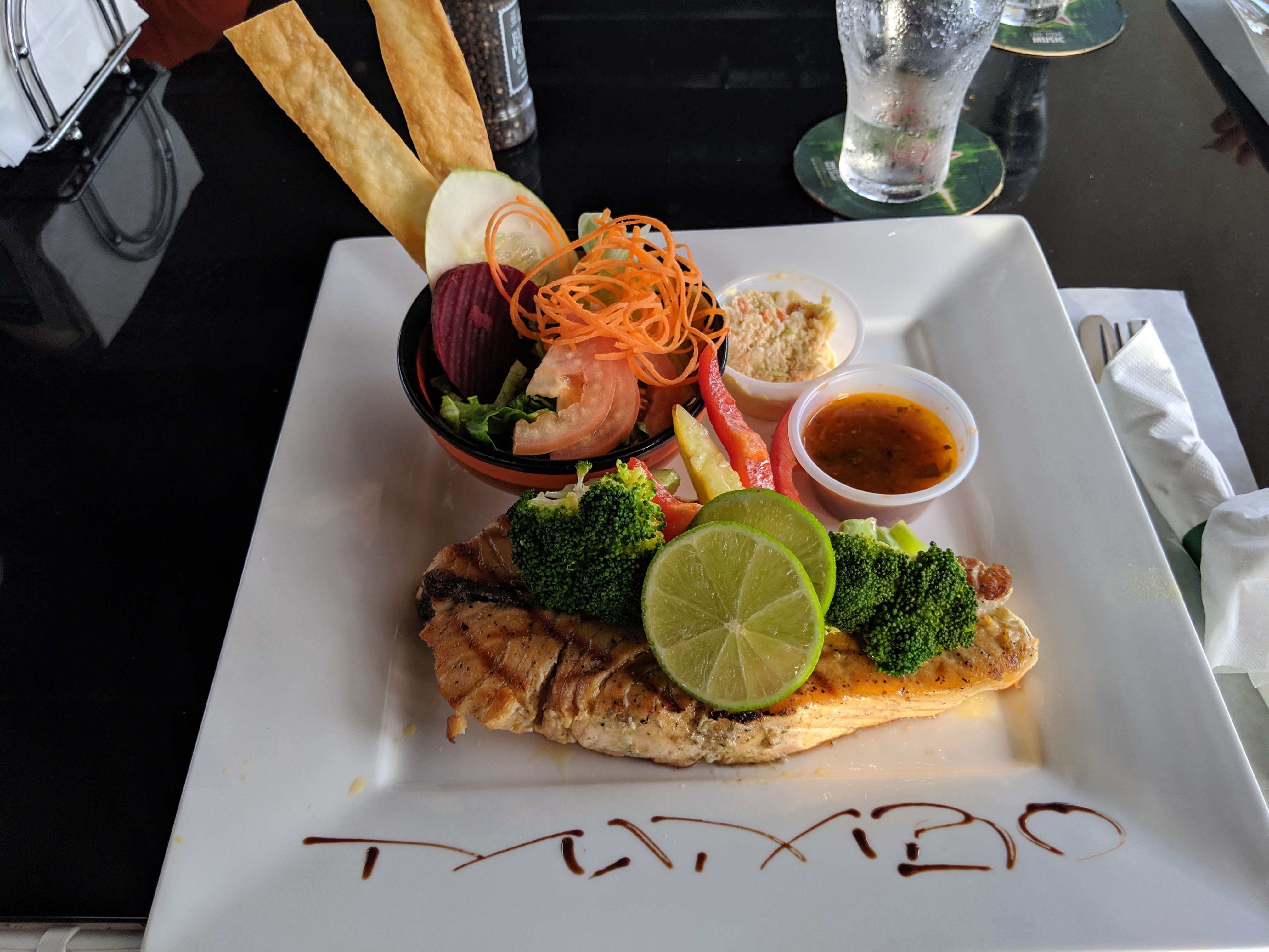Cody and I immediately went for the seafood section, come on … we are on an island. Cody went for the Red Snapper fillet, and I had the Atlantis Salmon Steak. I ALWAYS go for salmon! Both were done superbly. The fish was cooked just right, delicious side dishes, and elegant plating. We’re not sure what was written on the side of the plate in chocolate, but it was chocolate, so it’s all good! [I just took another look quickly … it says MAMBO!!]