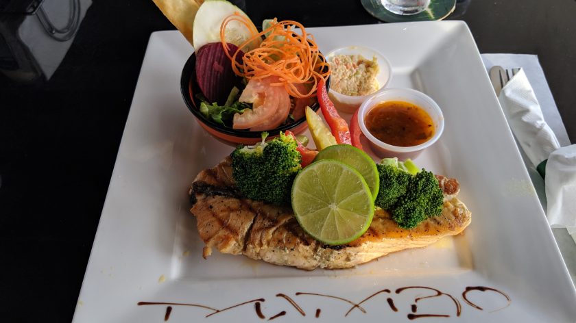 Cody and I immediately went for the seafood section, come on … we are on an island. Cody went for the Red Snapper fillet, and I had the Atlantis Salmon Steak. I ALWAYS go for salmon! Both were done superbly. The fish was cooked just right, delicious side dishes, and elegant plating. We’re not sure what was written on the side of the plate in chocolate, but it was chocolate, so it’s all good! [I just took another look quickly … it says MAMBO!!]
