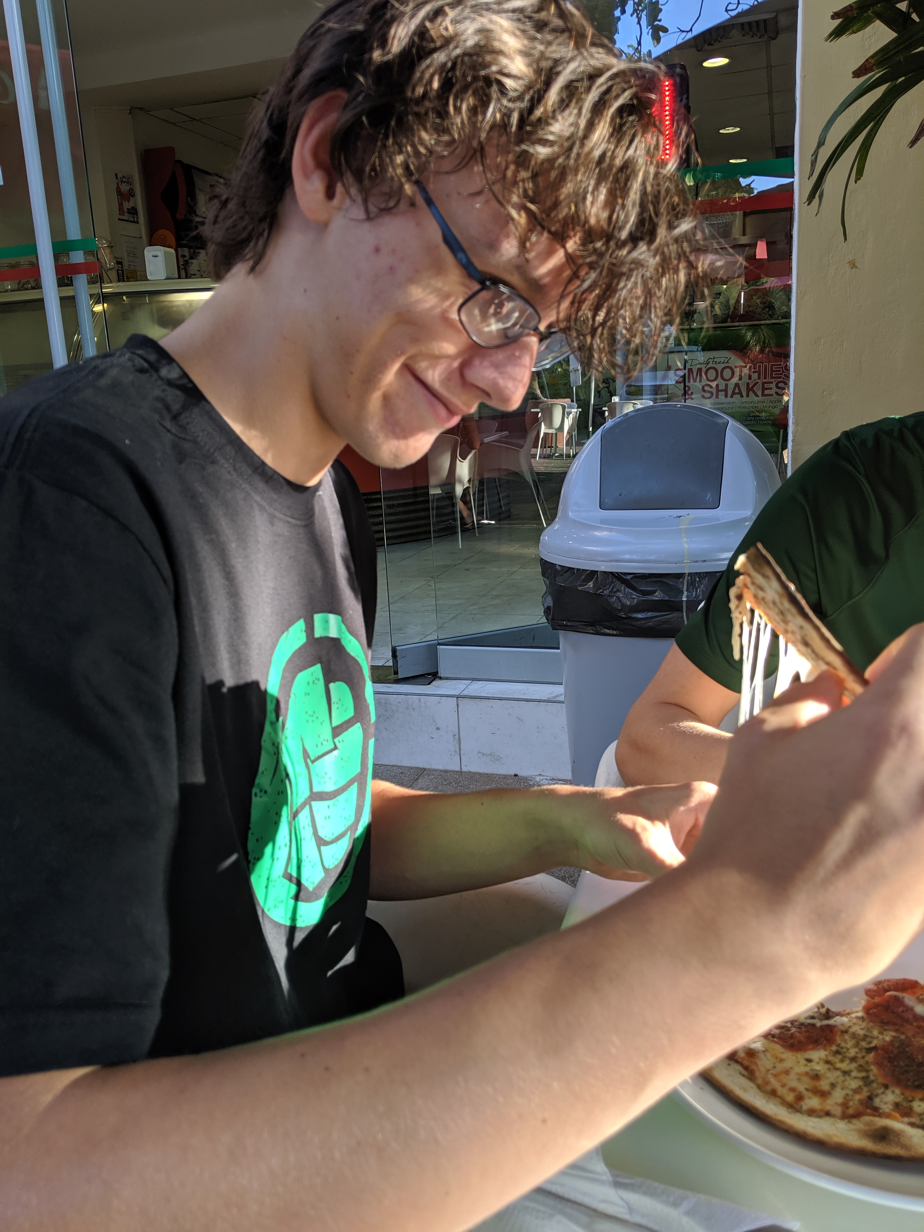 The older two decided they wanted the homemade pizza instead. They shared one pizza (four slices) as a pre-dinner snack. The pizza was delicious, according to the kids. I took a quick grab of some of the freshly melted cheese (since I can’t eat the gluten crust), and I concurred. One of my favorite parts of Gelati Bella Italia is that they have nice outdoor seating, so we could enjoy the tropical breeze.