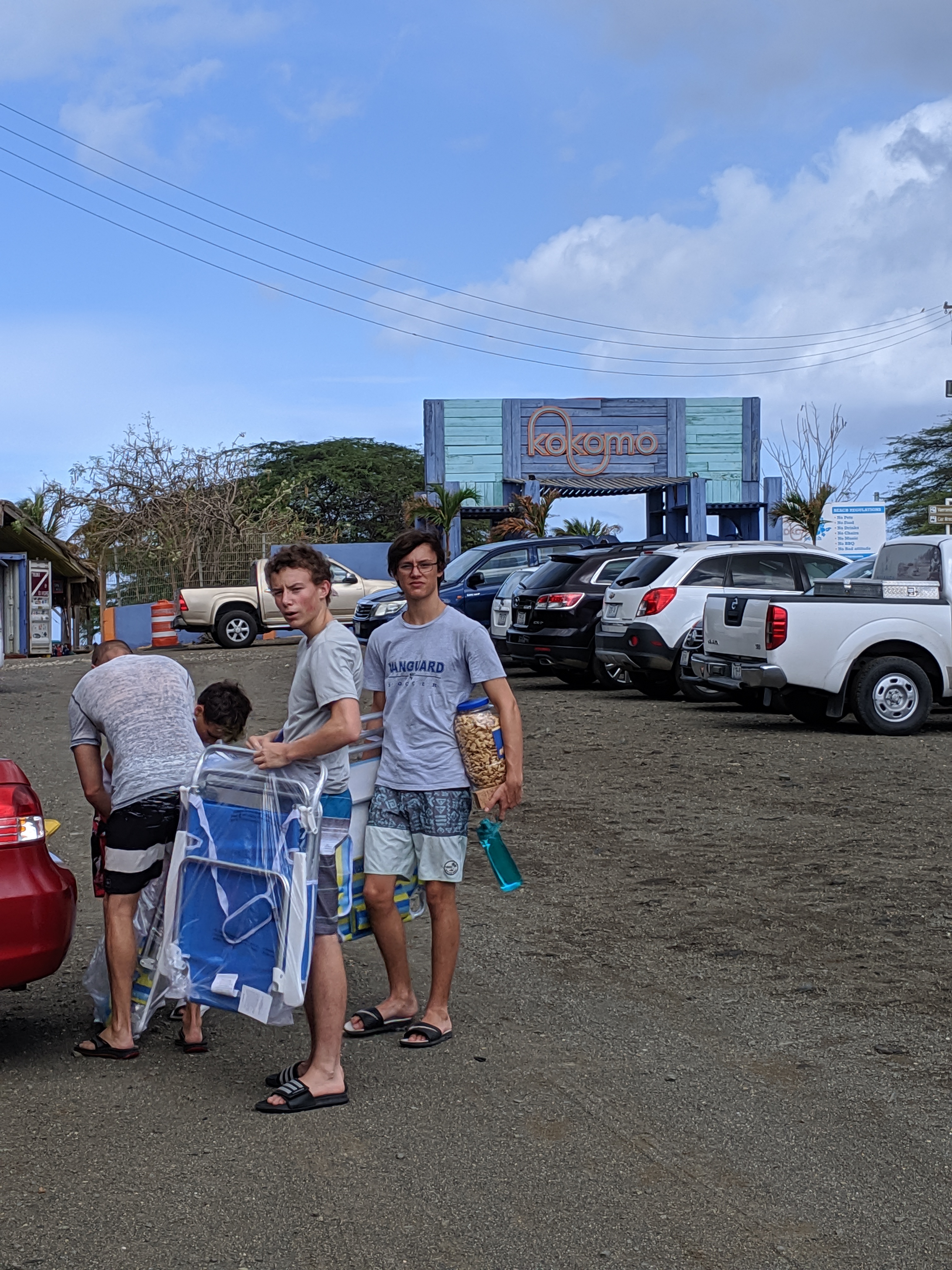 We chose to go to Kokomo Beach, mostly because I visited in February and had a picture of the swing in the water, which the boys insisted on seeing. When we arrived, we learned that the beach and parking are free, but you can’t bring in a cooler, food, drinks, or chairs! So we took all our stuff back to the car, one of us (me) might have tried to catch the iguana and roosters in the parking lot (not successful). With just our towels and books in hand, we took in the entire view.
