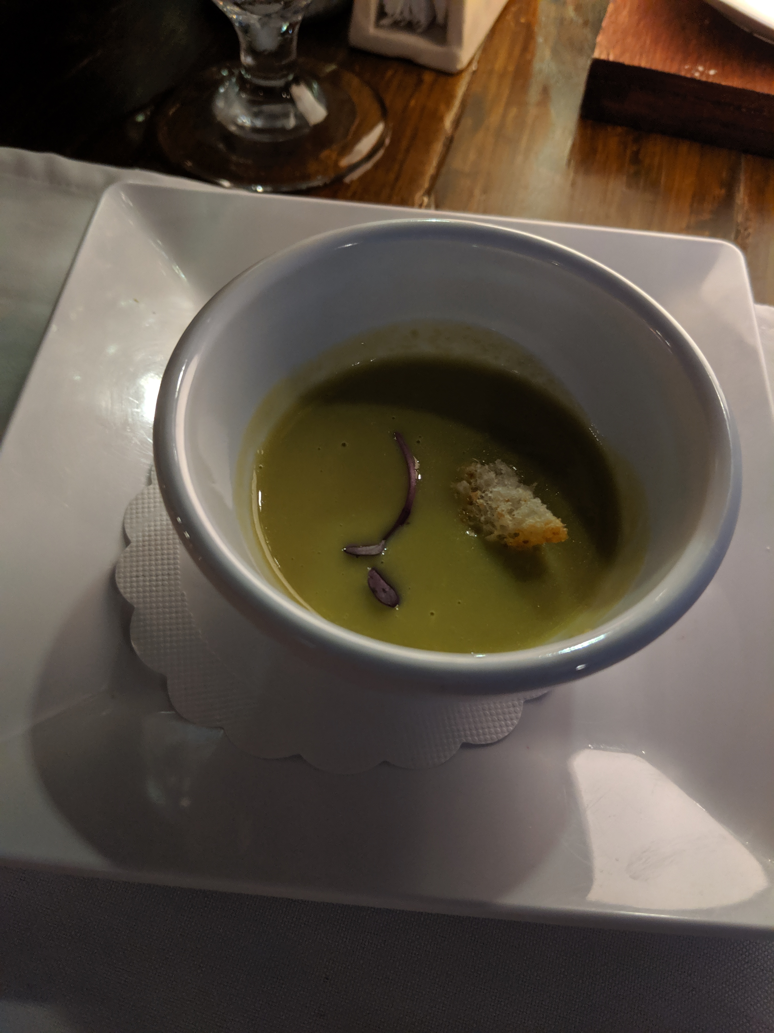 I included our menu of choices, but their regular menu is much more substantial. Cody ordered the soup, Ossobucco Milanese, and Banana Cake. Unusual for us, but we went completely opposite! I ordered the rolled chicken, salmon, and chocolate truffle. The rolled chicken had a nice flavor but was slightly overcooked. The salmon and chocolate were quite tasty. Cody seemed to enjoy his meal, but we needed to get home; it was WAY past our bedtime!