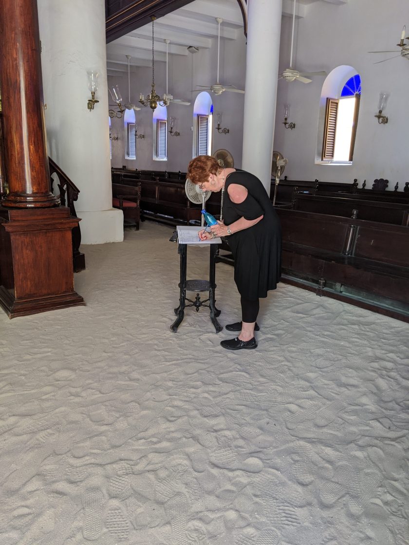 Mom and I entered the synagogue and were immediately amazed. The sand on the floor was hard to miss. We had heard a little about this on our tour of the Blue Curaçao Liquor, but we weren’t really sure why it was there. According to The Smithsonian Magazine, I learned that the sand is “both to remind congregants of the 40 years the Jews spent wandering the desert in biblical times and also to pay homage to their Portuguese ancestors who, before finding refuge from the Inquisition in Holland, used sand to muffle the sounds of sacred prayers and songs.” There was a sense of peace as we quietly moved throughout the historical building. My favorite picture is Mom signing the visitors’ book.