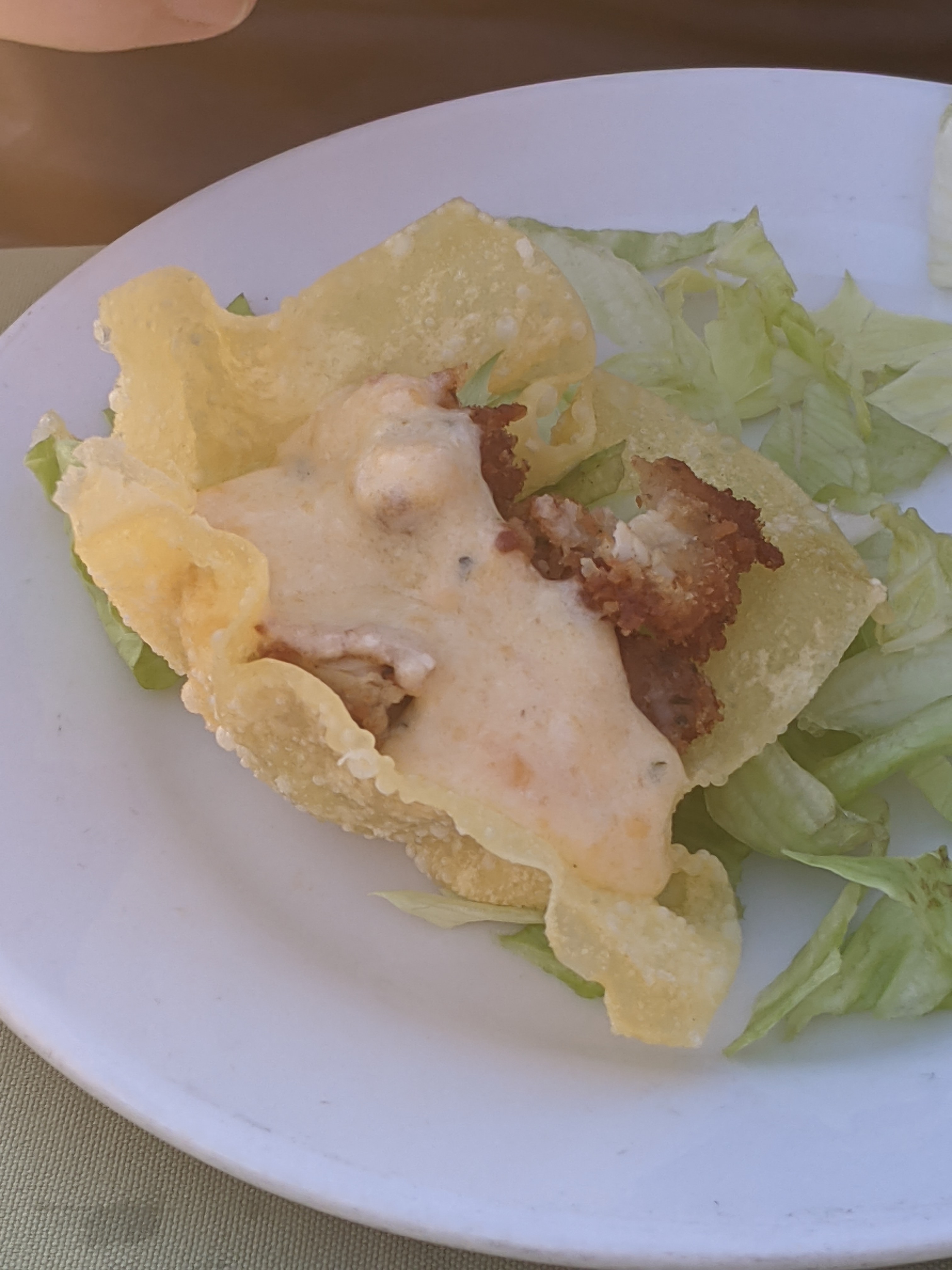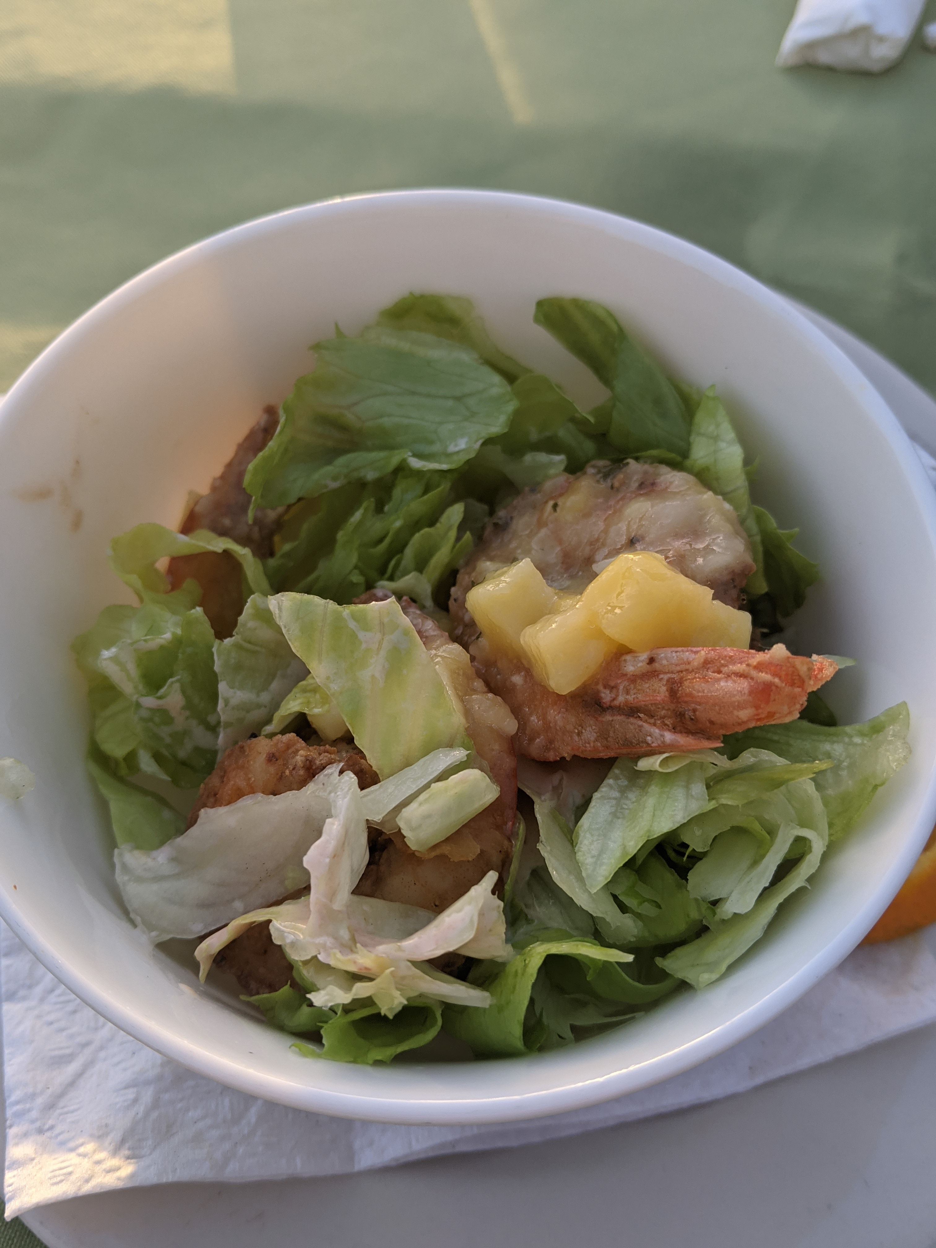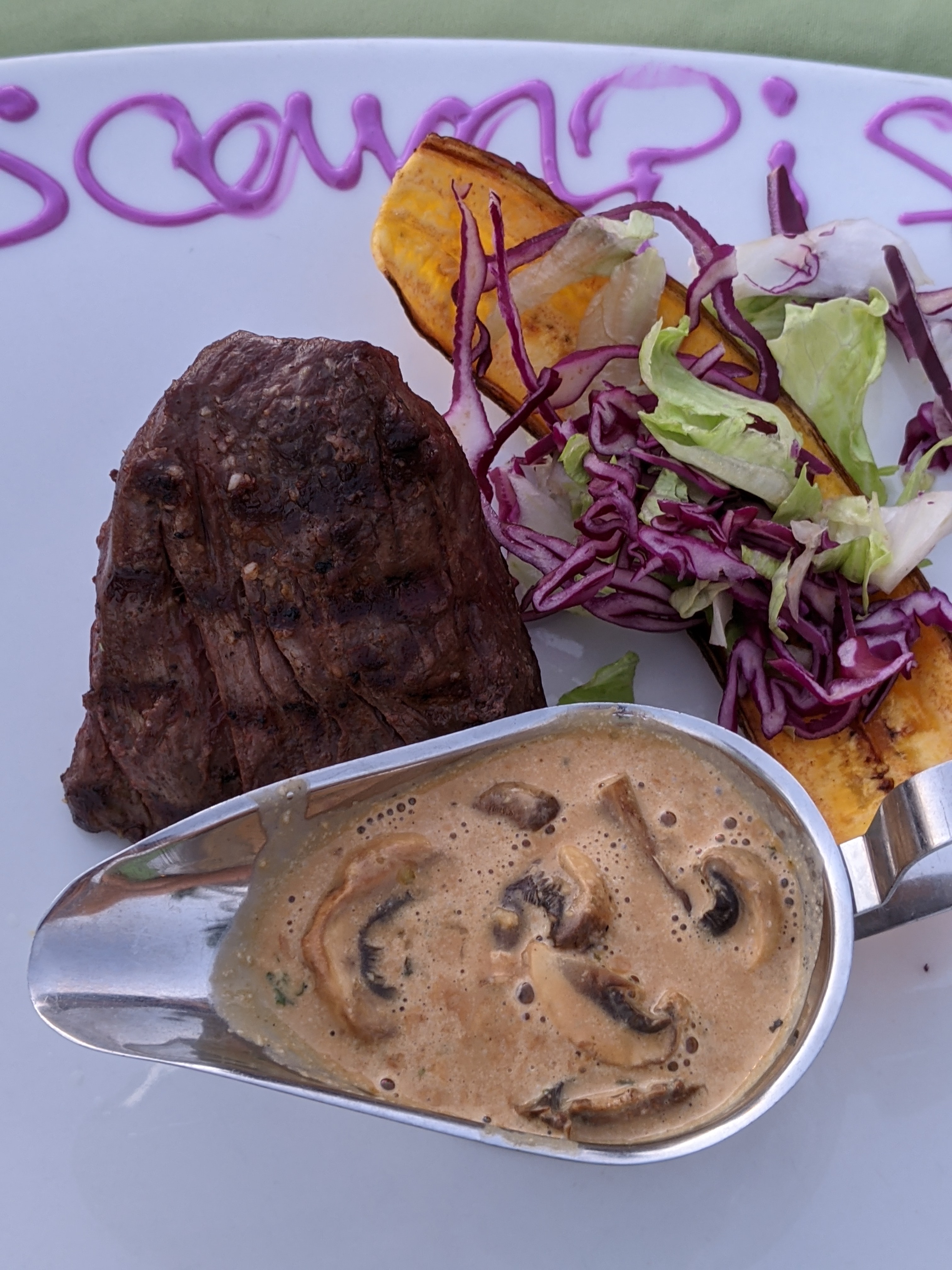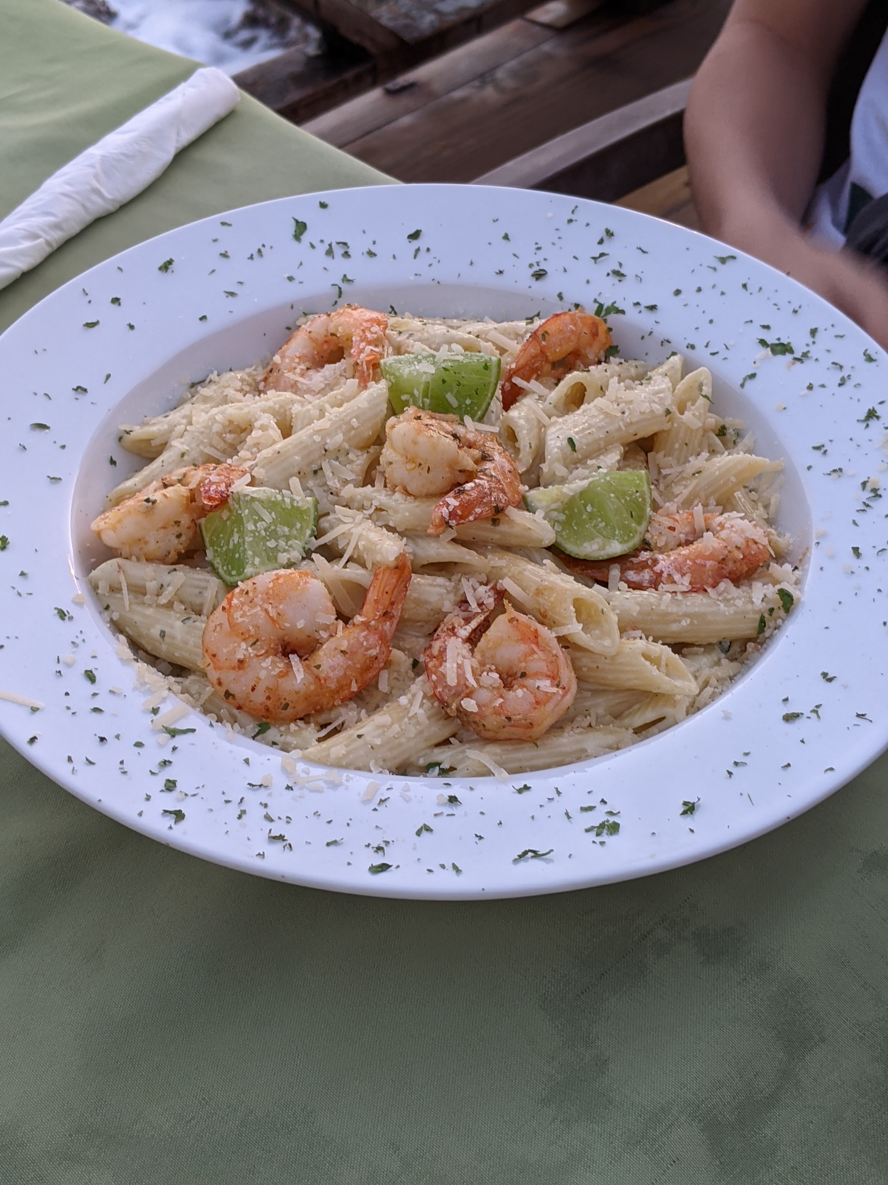 Let’s be real, even if the food wasn’t great, Scampi’s delivers stunning ambiance! This picturesque restaurant is in Punda, but away from the hustle of “city life”. The outside dining area is right over the crashing waves, and in the evening, the sun setting over the water is picture-perfect. Scampi’s is one of three restaurants located in the historic Waterfort Terrace, with Perla Del Mar and Dal Toro. Pull right up to the area and there is parking right out front, however, if you arrive before 6 PM, there is a fee for parking.