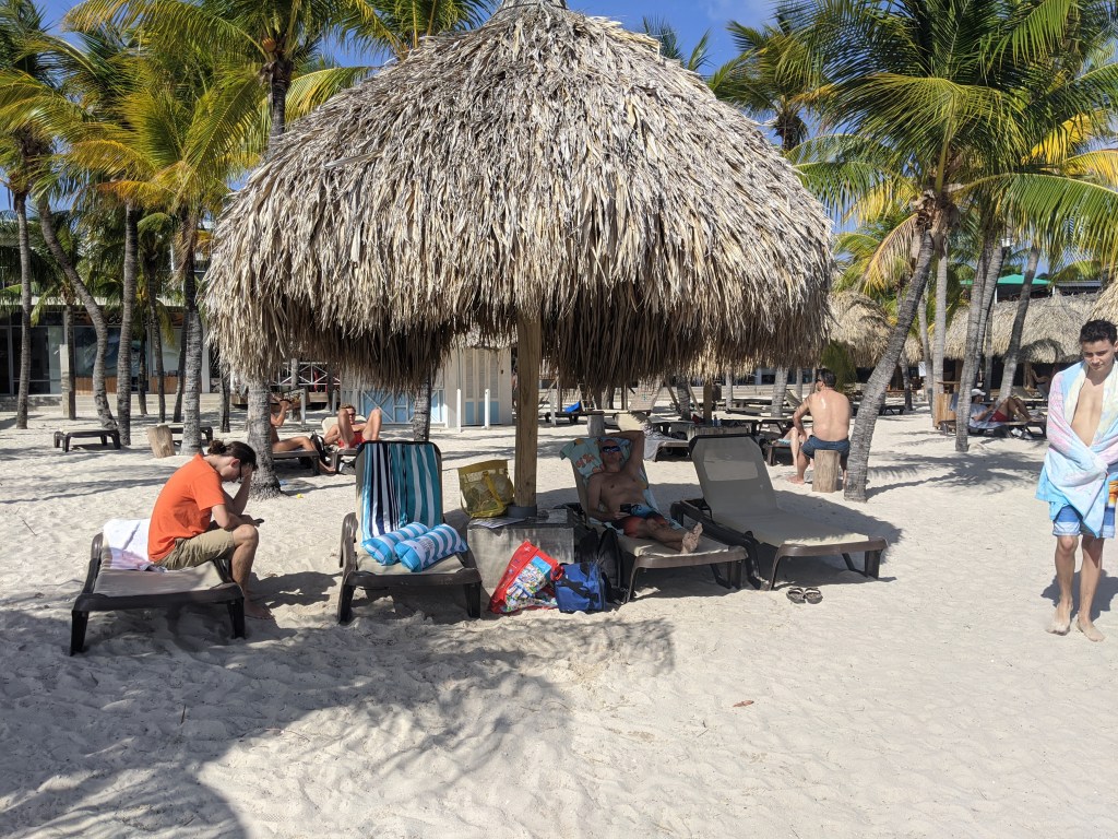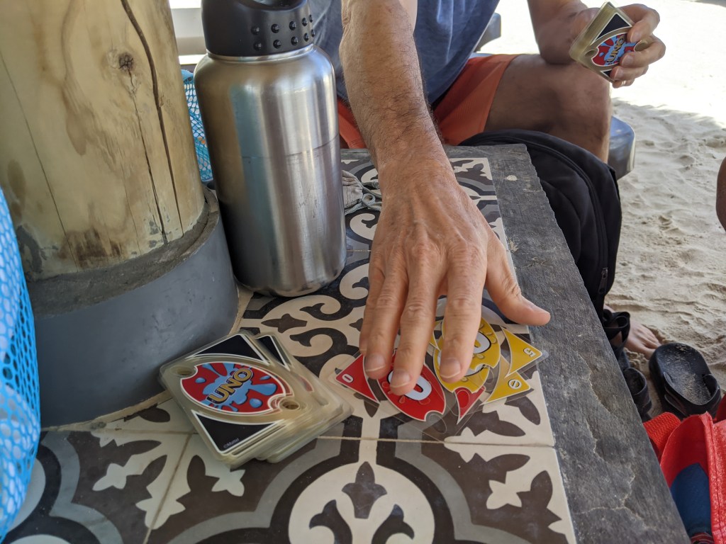 This might have been the easiest beach to navigate here, or we are becoming professionals. The parking lot is free and we haven’t ever not found a space. When you enter it looks like a USA boardwalk shopping area. Then you arrive at a vast expanse of beach. They are earmarked as different parts associated with the food hut near by, but we just found empty space and settled. We ended up in the Bonita serving area and would recommend it to others. The beach is free, but chairs will cost you. Each lounge chair was $4 US or 7 NAF. We chose three under a palapa – no charge for the shade! Nice! Plus that offered a “table” to play Uno with our waterproof Uno cards.
