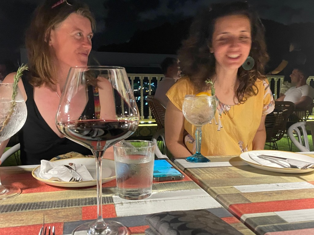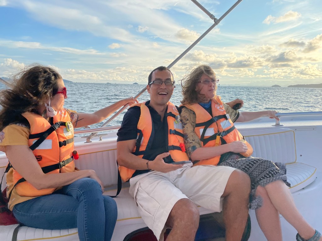 Having said all this, I thoroughly enjoyed the evening. The eight of us enjoyed the views, the sunset, and belly laughs that ensued. The crew asked us what kind of music we wanted, so there was a constant stream of music during the trip. After the first stop with champagne, we learned how to drink it quickly while stopped, so we wouldn’t end up with champagne all over our faces and tops as we sped off.