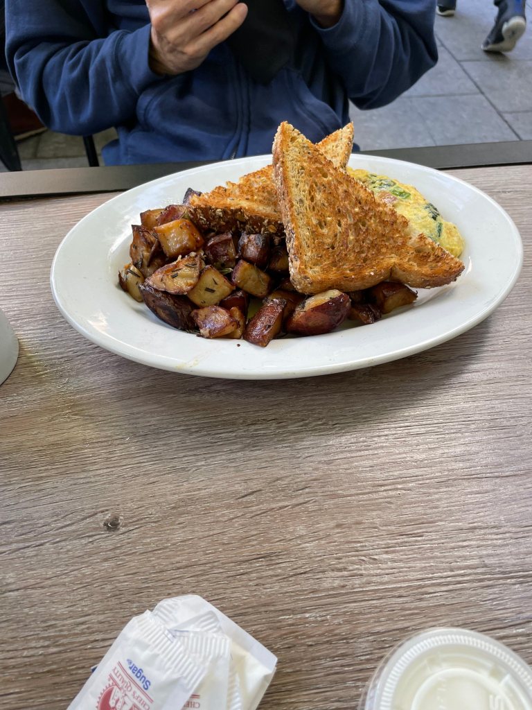 After a bit of searching, we eventually located an ATM and ended up at Green Eggs Cafe, which, as luck would have it, was cash-only as well. We patiently waited for about 15 minutes and were seated outdoors. The food was undeniably delicious, with a richness that hit the spot. Rhys made a bold choice by ordering the cookie dough stuffed French toast. Initially, it seemed like the perfect selection, but it quickly led to a massive sugar rush for him.